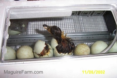 Five day later the incubator arrives and the first batch of eggs are placed in it.
