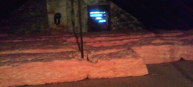 This attic has not only blown in loose insulation, but fiberglass batts, which also shatter and float around in small particles. Notice the vent at the end of the catwalk which is opened to the outside. The next time you walk past a building or home, look up and spot the attic vent and be aware of what type of toxic matter could be coming out into the air you are breathing in. Sometimes the air has a smell to it, sometimes it does not, or it does and you are just not intune to it.