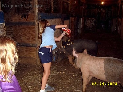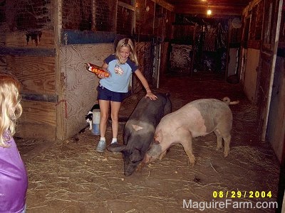 Amie and Sara feeding Wilbur and Fern crackers Pigs are about 6 months